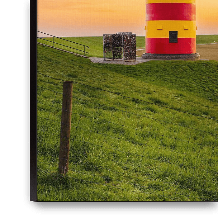 Der Himmel färbt sich orange und spiegelt sich im Wasser hinter dem Leuchtturm.