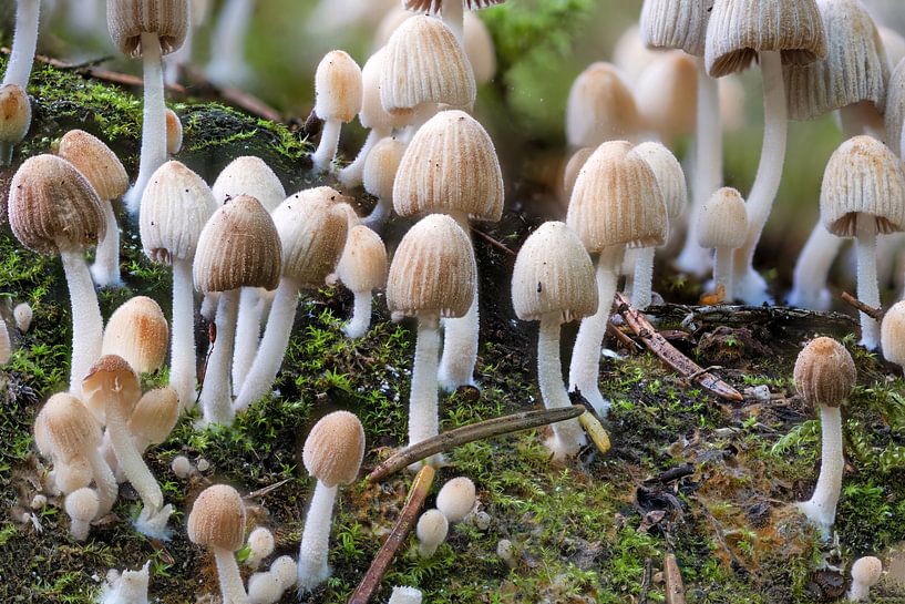 Bestelle das Foto Pilzkolonie Voreilender Helmling von Hans-Jürgen Janda als Reproduktion auf Leinwand, Alu-Dibond, als Poster, Fototapete oder Acrylglasbild.