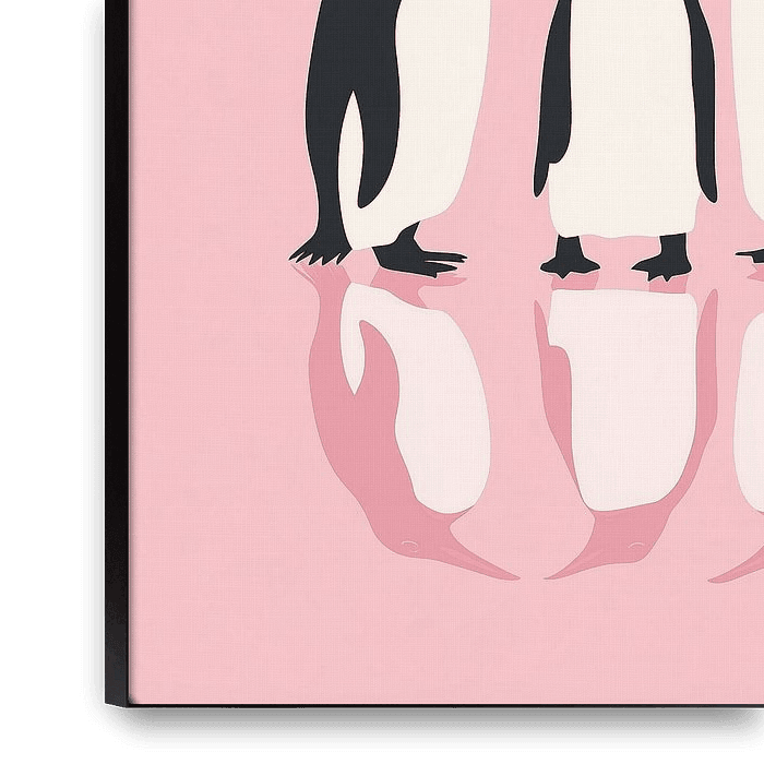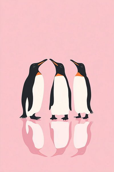 Eine verspielte, minimalistische Komposition vereint drei Pinguine, die sich offenbar unterhalten. Sie stehen ordentlich nebeneinander, genau in der Mitte eines rosa Hintergrunds. Das Rosa ist sanft, gewagt und fröhlich. Die Pinguine, gehüllt in ihr charakteristisches schwarz-weißes Gefieder, wirken fast elegant gekleidet, während…