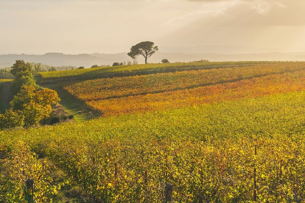 Pinienwälder und Weinberge, Herbstlandschaft im Chianti-Gebiet bei Sonnenuntergang. Pievasciata, Castelnuovo Berardenga, Region Toskana, Italien