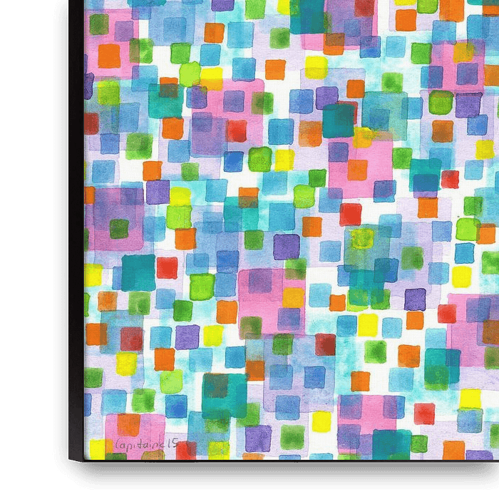 This wonderful pattern consists out of hundreds of translucent, colorful squares in different sizes, partly overlapping each other. They are ordered horizontally and vertically. Large pink squares beneath are influencing the overall impression of this vivid picture. The white gaps where the original color of the paper is still visible…