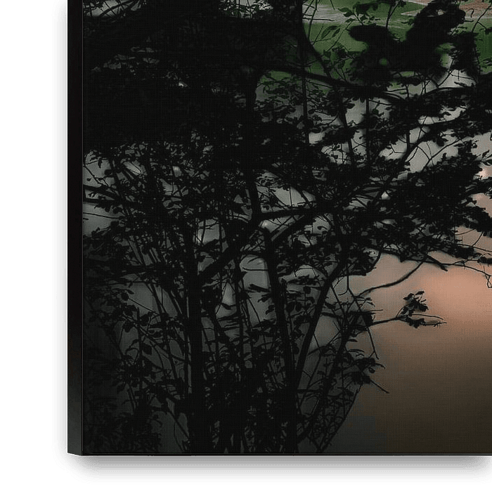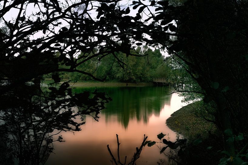 Das Wasser hat einen sanften rosa Schimmer, gefangen unter dem grünen Blätterdach, das das Bild umgibt. Die Brücke führt den Blick entlang des Ufers, während die Reflexion die Farben des Himmels zurückwirft. Ein Moment der Ruhe, Farbe und natürlicher Vielschichtigkeit – klar, stimmungsvoll und einladend.