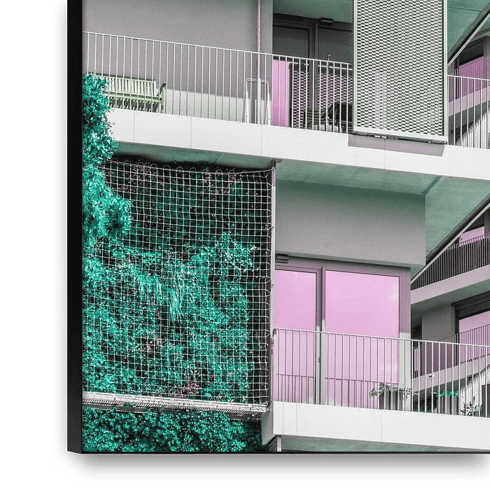 Dieses digitale Kunstwerk zeigt ein modernes, mehrstöckiges Wohngebäude mit Balkonen, das durch seine ungewöhnliche Farbgebung sofort ins Auge fällt. Die Fenster spiegeln ein kräftiges Pink wider, das sich auch im Himmel des Hintergrunds wiederfindet. Diese bewusste Farbwahl verleiht der Szene eine fast traumhafte Qualität. Auf einigen…