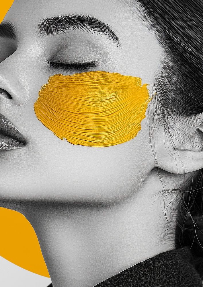 Eine Schwarz-Weiß-Fotografie einer eleganten Frau, deren Gesicht mit Pinselstrichen in Senfgelb subtil akzentuiert und in einem minimalistischen Stil ausgeführt ist. Ein heller, senfgelber Kreis schwebt hinter ihrem Kopf und bildet einen weichen, harmonischen Hintergrund. Diese Kombination aus monochromer Fotografie mit dem warmen Akzent der Pinselstriche und des Kreises schafft einen modernen Kontrast und unterstreicht die raffinierte Einfachheit und charakteristische Schönheit des Bildes.