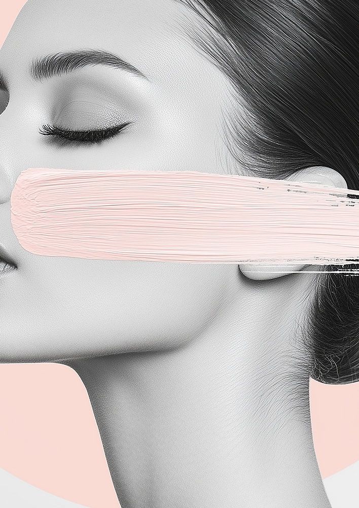 Eine Schwarz-Weiß-Fotografie einer eleganten Frau, deren Gesicht mit zarten Pinselstrichen in errötlichem Rosa zart akzentuiert ist, ausgeführt in einem minimalistischen Stil. Hinter ihrem Kopf schwebt ein heller, erdfarbener Kreis, der einen subtilen und ruhigen Hintergrund bildet und der Komposition eine weiche, feminine Note verleiht. Die Kombination der monochromen Fotografie mit den zartrosa Pinselstrichen und dem Kreis schafft einen harmonischen Kontrast, der die Schlichtheit und Raffinesse des Bildes unterstreicht und gleichzeitig einen Hauch von Farbe und Zartheit hinzufügt.