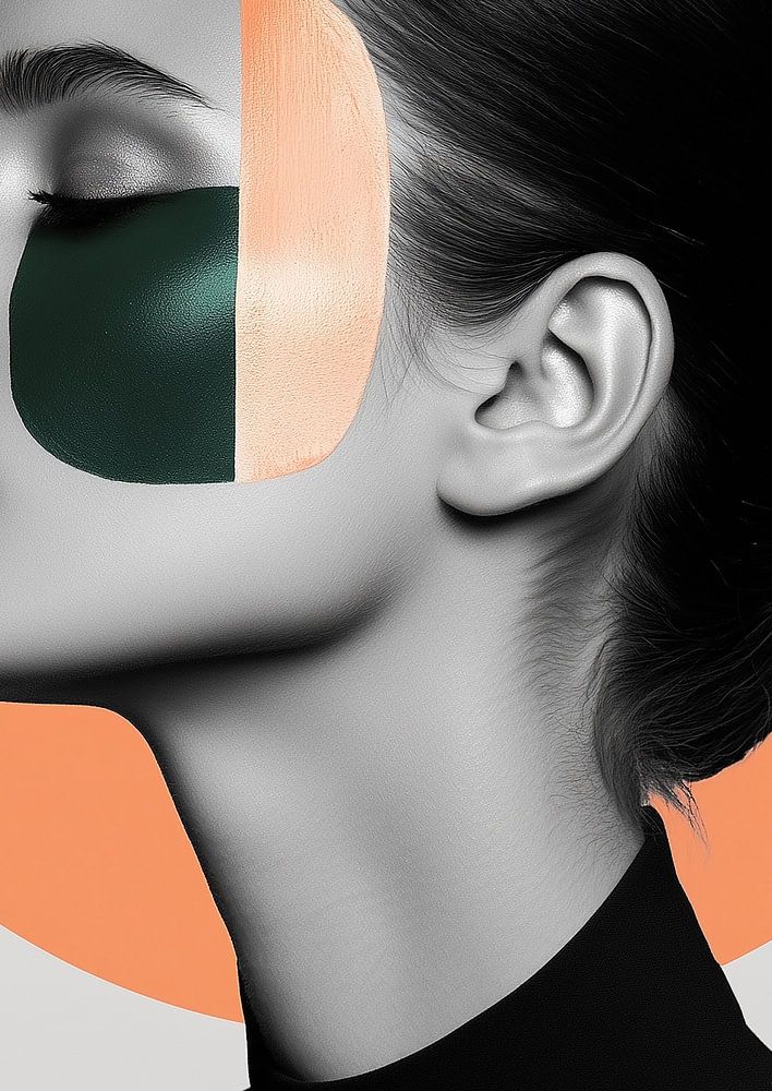Eine Schwarz-Weiß-Fotografie einer eleganten Frau, die mit Pinselstrichen in Pfirsich und Waldgrün auf ihrem Gesicht in einem minimalistischen Stil subtil akzentuiert ist. Hinter ihrem Kopf befindet sich ein weicher pfirsichfarbener Kreis, der einen ruhigen und warmen Hintergrund schafft und der Komposition einen Hauch von Weichheit verleiht. Die Kombination der monochromen Fotografie mit den warmen pfirsichfarbenen Pinselstrichen und den tiefen, natürlichen waldgrünen Akzenten schafft einen raffinierten Kontrast, der die Schlichtheit des Bildes unterstreicht und gleichzeitig ein frisches und erdiges Gefühl vermittelt.