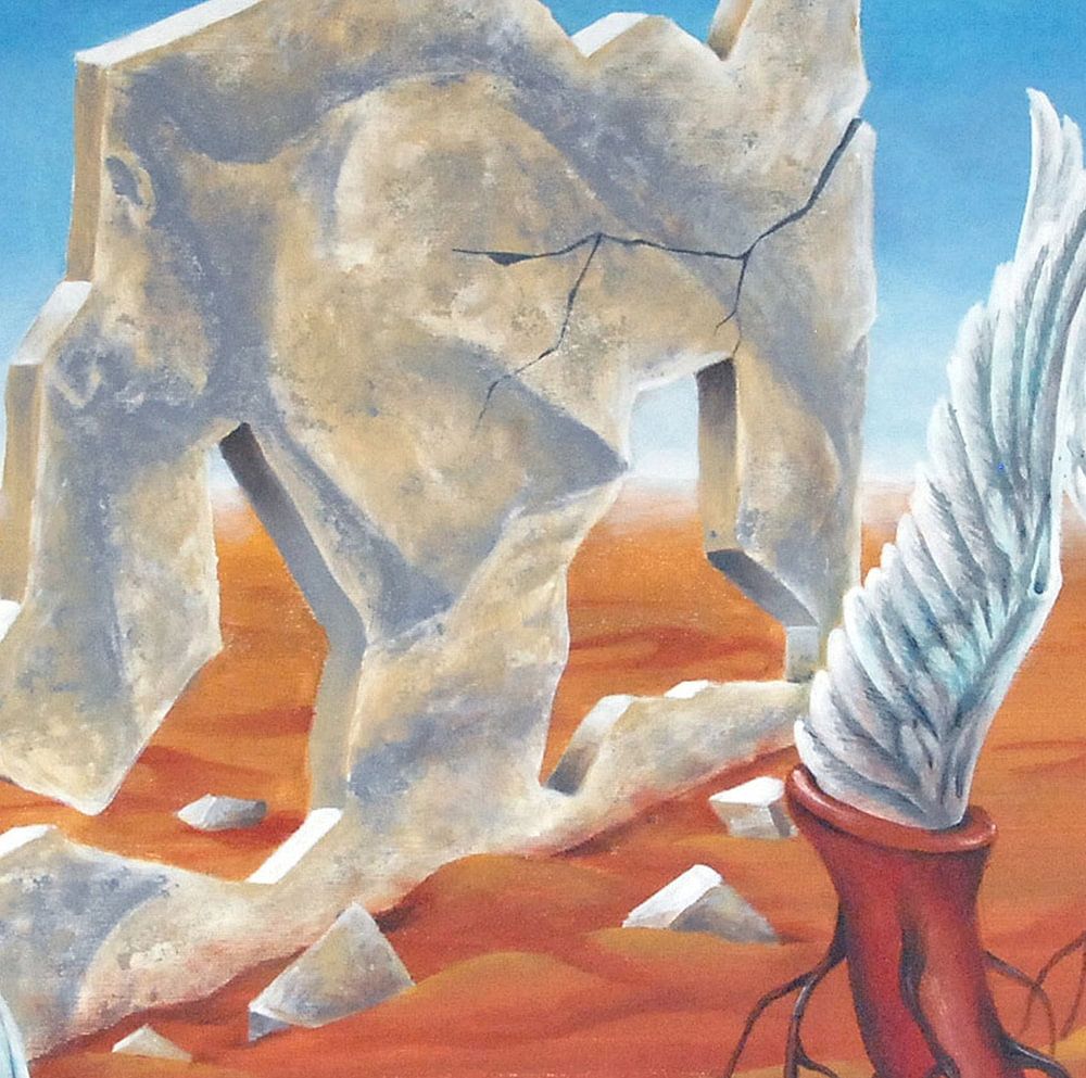 In diesem surrealistischen Gemälde habe ich versucht, mir einen Planeten vorzustellen, auf dem einst Leben existierte. Auf der Steinplatte sind noch Spuren der Zivilisation zu sehen. Nach einer Pandemie mit einem gefährlichen Virus oder aus einem anderen Grund sind nur noch fantastische Wesen auf dem Planeten übrig geblieben.