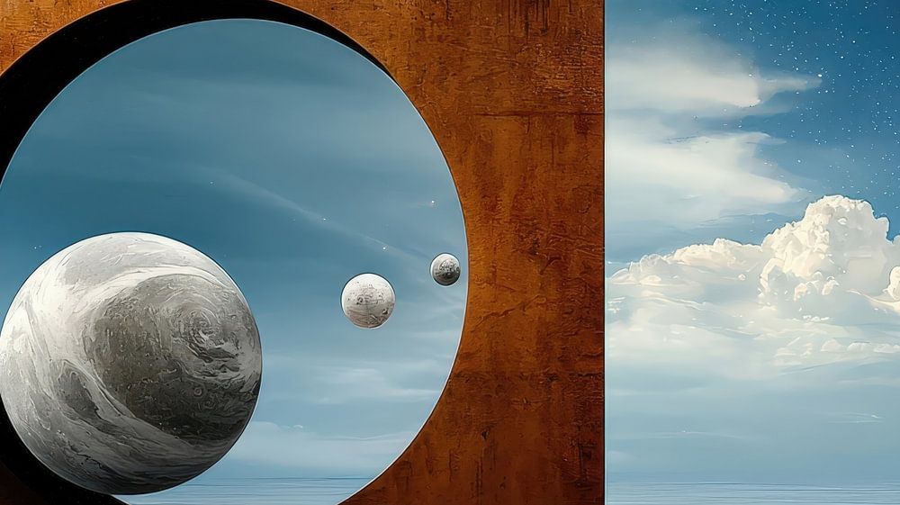 Dieses Bild zeigt eine monumentale Szene, in der geometrische Formen und kosmische Elemente harmonisch miteinander verschmelzen. Ein massiver, rostfarbener Bogen ragt vor einer klaren, tiefblauen Himmelslandschaft empor. In seinem Zentrum schwebt eine gigantische, von Grautönen durchzogene Kugel, die wie ein Planet erscheint. Sie wird von zwei kleineren Kugeln begleitet, die ebenfalls im Raum zu schweben scheinen und das Motiv des kosmischen Gleichgewichts verstärken. Der Bogen selbst bildet eine Art Tor oder Fenster in eine andere Dimension, das den Blick auf eine friedliche, fast surreal wirkende Szenerie lenkt.
