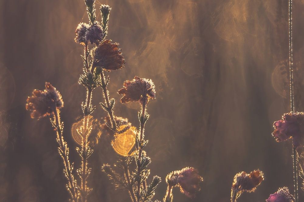 Nahaufnahme von Erica tetralix, einer wildwachsenden Pflanze in der Heide. Das Foto wurde im goldenen Licht der aufgehenden Sonne aufgenommen und in stimmungsvollen Tönen bearbeitet.