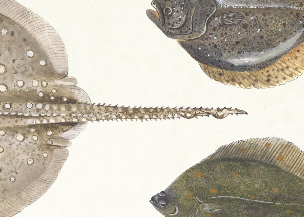 Collage aus Plattfisch und Dornrochen. Fische, die in unserer Nordsee leben. Aquarellzeichnung von Jasper de Ruiter.