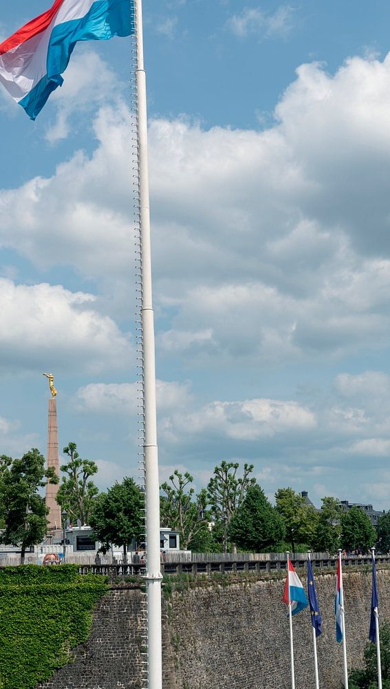 Luxemburg Blick vom Place de la Constitution entlang der formalen Zitadellengärten. Die luxemburgische Flagge weht an einem sehr langen Fahnenmast. Vertikal gesticktes Panorama. Sommer, Stadt, sonnig, Tag, Platz der Nation,