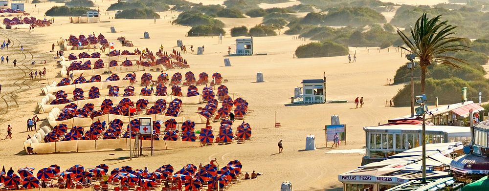 Der Strand von Playa del Ingles mit Sonnenschirmen und die Dünen von Maspalomas bei stürmischen Wind, San Bartolomä de Tirajana, Gran Canaria, Kanarische Inseln, Spanien