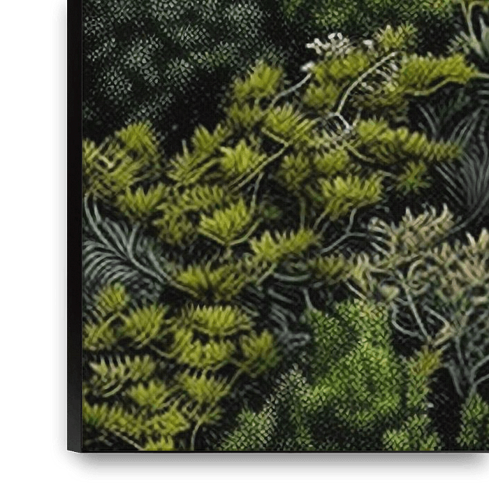 Eine reich strukturierte digitale Illustration, die einen dichten, dunkelgrünen Wald aus der Luftperspektive zeigt. Die Szene ist in einem pointillistischen Stil gerendert, mit weißen Punkten, die über das Laub und Unterholz verstreut sind, um Tiefe und einen visuellen Rhythmus zu erzeugen. Der obere Teil des Bildes weist eine…