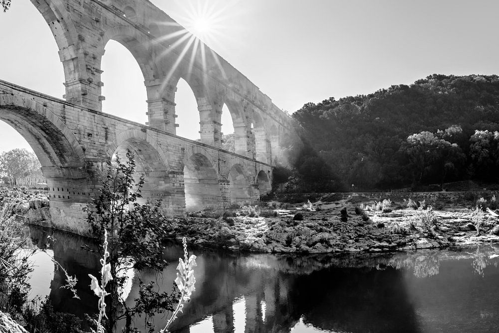 Römisches Aquädukt / Brücke in Frankreich / Südfrankreich am Fluß Gard / Gardon zum Sonnenaufgang in schwarzweiß .
