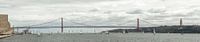 Aufnahme der markanten Schrägseilbrücke in Lissabon. Unterhalb der Brücke, eine Armada von Segelbooten an einem windigen Tag.