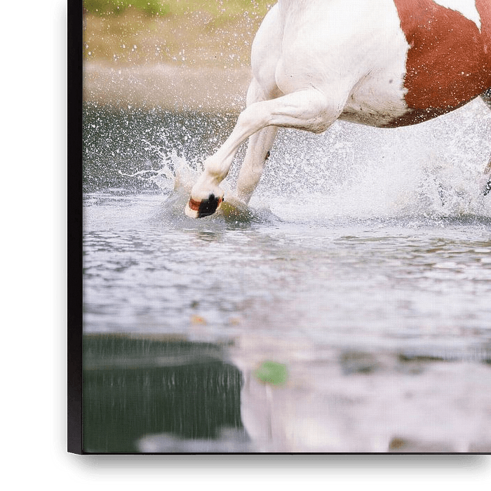 Bestelle dieses Landschafts-Wandbild Pony galoppiert durch das Wasser von VeraMarjoleine fotografie als Reproduktion auf Leinwand, Alu-Dibond, als Poster, Fototapete oder Acrylglasbild.
