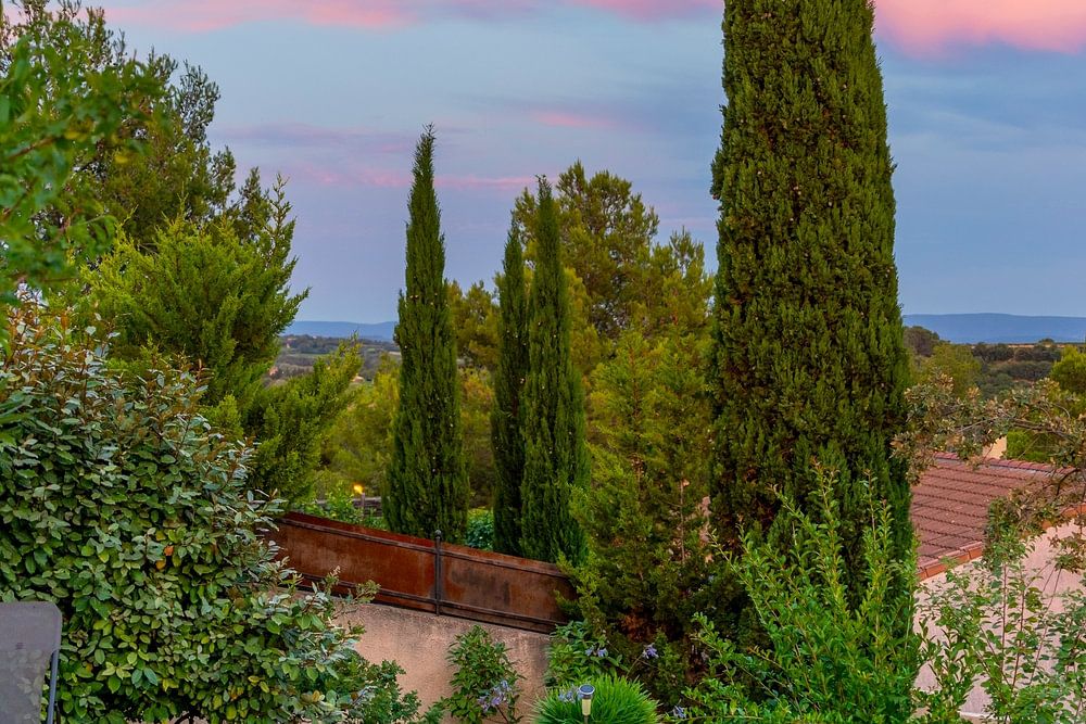 Idyllische Landschaft mit einem kleinen Swimmingpool in Beaumes-de-Venise, einer Gemeinde im Département Vaucluse in der Provence im Südosten Frankreichs, am Abend