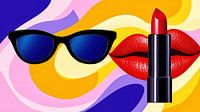 Sinnliche rote Lippen, ein kräftiger roter Lippenstift und stilvolle Sonnenbrillen vereinen sich mit einem dynamischen, welligen Hintergrund in dieser von Pop-Art inspirierten Illustration. Ein Ausdruck von Schönheit, Mode und Selbstbewusstsein.
