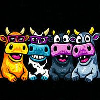 Dieses Kunstwerk zeigt vier farbenfrohe Cartoon-Kühe, die sich spielerisch und ausdrucksstark vor einem tiefschwarzen Hintergrund abheben. Jede Kuh hat ihren eigenen Charakter und ein auffälliges Aussehen: eine orangefarbene Kuh mit lila Brille und breitem Lächeln, eine schwarz-weiße Kuh mit blauem Maul und lila Brille, eine dunkelgraue…