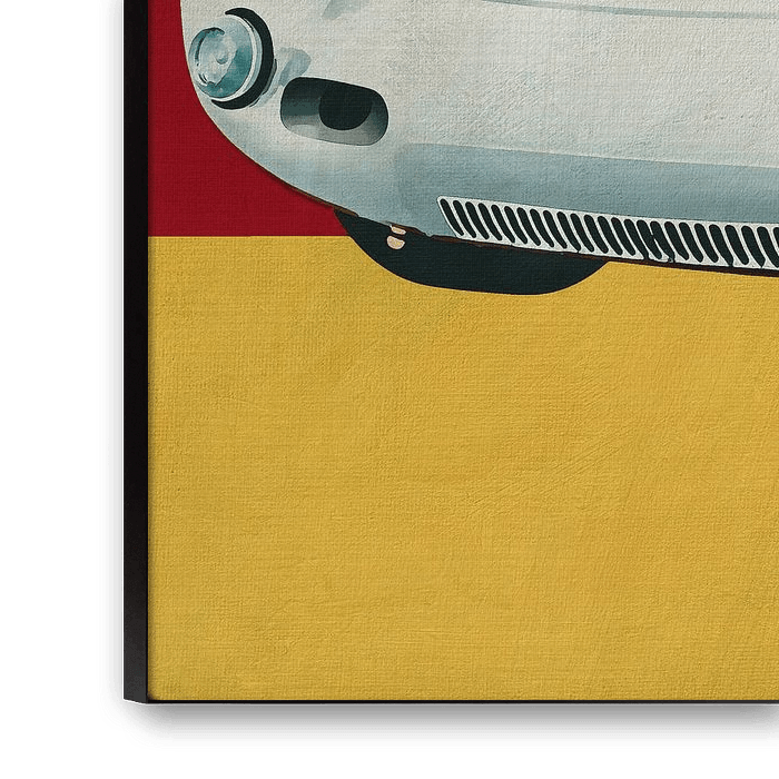 Dieses Gemälde des Porsche 550-A Spyder von 1956 vor der deutschen Flagge kann in verschiedenen Größen erworben und auf Leinwand sowie auf Holz und Metall gedruckt werden. Sie können das Gemälde auch mit einer Acrylplatte darüber veredeln lassen, die ihm mehr Tiefe verleiht.
