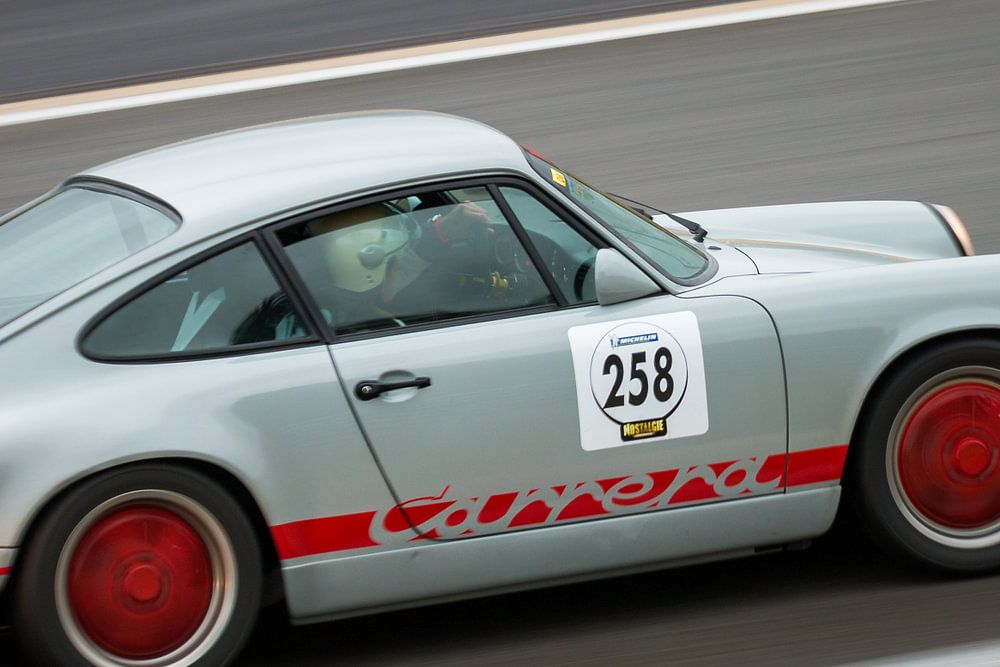 Klassischer Porsche 911 Carrera RS auf dem Circuit Spa-Francorchamps von 1974. Ein Auto für den wahren Enthusiasten. Aufgrund der verwendeten Technik spritzt die Geschwindigkeit des Bildes.