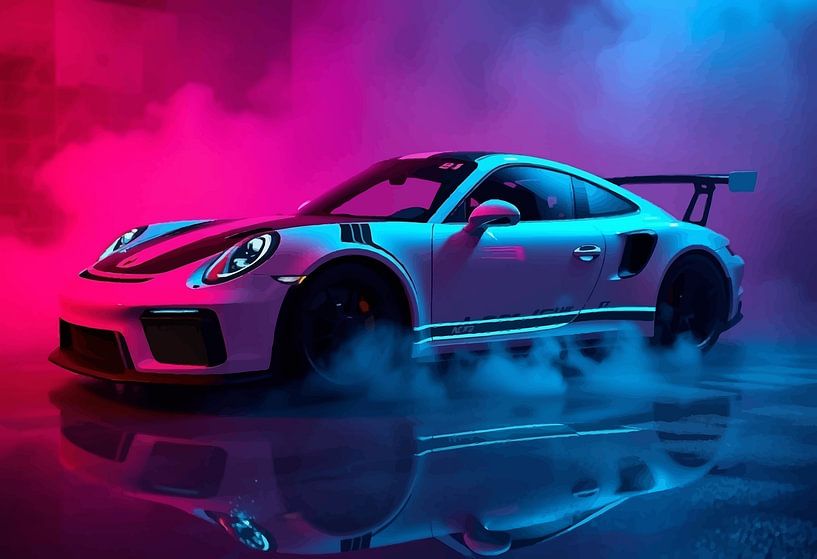 Bestelle dieses abstrakte Wandbild Porsche 911 GT3 RS Neon Rauchige Ausstellungsraum Kunst von MIROKKU als Reproduktion auf Leinwand, Alu-Dibond, als Poster, Fototapete oder Acrylglasbild.