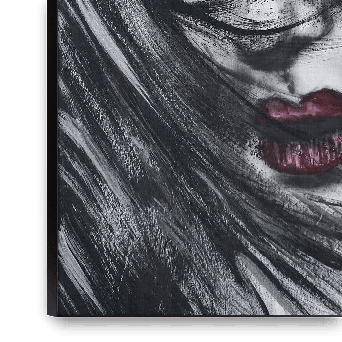 Entdecken Sie den Zauber unseres minimalistischen Schwarz-Weiß-Porträts, das eine starke weibliche Energie ausstrahlt. Dieses Gemälde mit seinem chaotischen, wilden, vom Wind geformten Haar fängt einen eindringlichen Blick und die Tiefe der hautblauen Augen ein, die von…