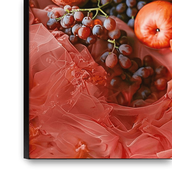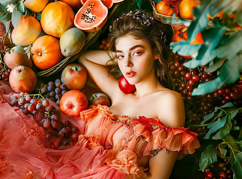 Ein lebendiges Porträt einer Frau, umgeben von bunten Früchten und blühenden Blumen. Sie posiert anmutig in einer kunstvollen Komposition mit reichhaltigen Texturen und lebendigen Farbtönen.