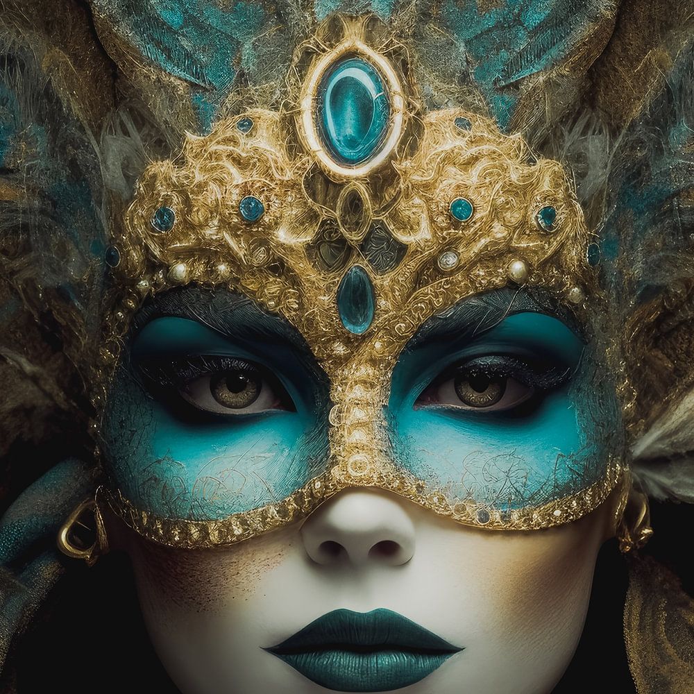 Masquerade ist ein Album mit faszinierenden Porträts einer Frau, die eine türkisfarbene Goldmaske vor einem dunklen Hintergrund trägt und die Komplexität der menschlichen Identität erforscht. Es wirft Fragen über die Dualität der menschlichen Existenz, die Rolle von Masken beim Verbergen oder Enthüllen dessen, was wir wirklich sind, und die Spannung zwischen dem öffentlichen und dem privaten Selbst auf. Das Gemälde lädt den Betrachter ein, über die vielen Schichten des menschlichen Ausdrucks und das ewige Spiel von Identität und Verkleidung in unserer Gesellschaft nachzudenken.