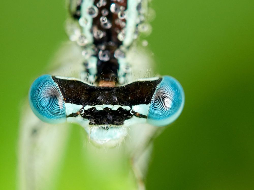 Makrofoto einer Libelle im Grünen. Da das Foto morgens aufgenommen wurde, ist die Libelle mit Tautropfen bedeckt. Die niedrigen Temperaturen ermöglichten es der Libelle außerdem, für ein Porträt still zu stehen.