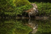 Ein Porträt einer Singdrossel, die zum Trinken und Baden in einen Teich am Waldrand kommt. Die Spiegelung im Wasser vervollständigt das Bild. Ein schönes und heiteres Bild.