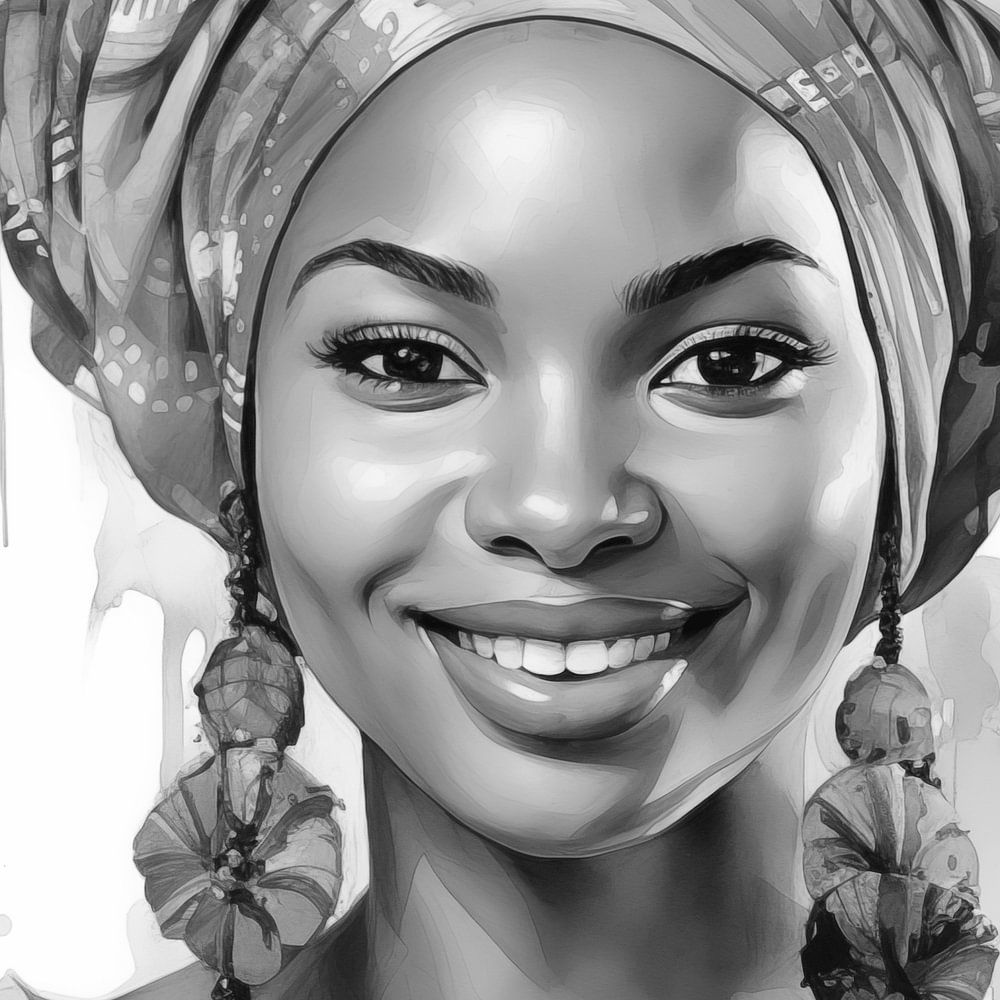Porträt einer afrikanischen Frau mit lächelndem Aquarell-Kunstdesign und Kopftuch auf weißem Hintergrund Schwarzweißfotografie