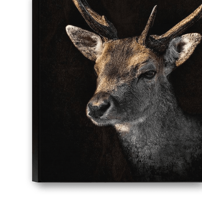 Porträt eines Hirsches mit dunklem Hintergrund und großem Geweih als Gemälde.