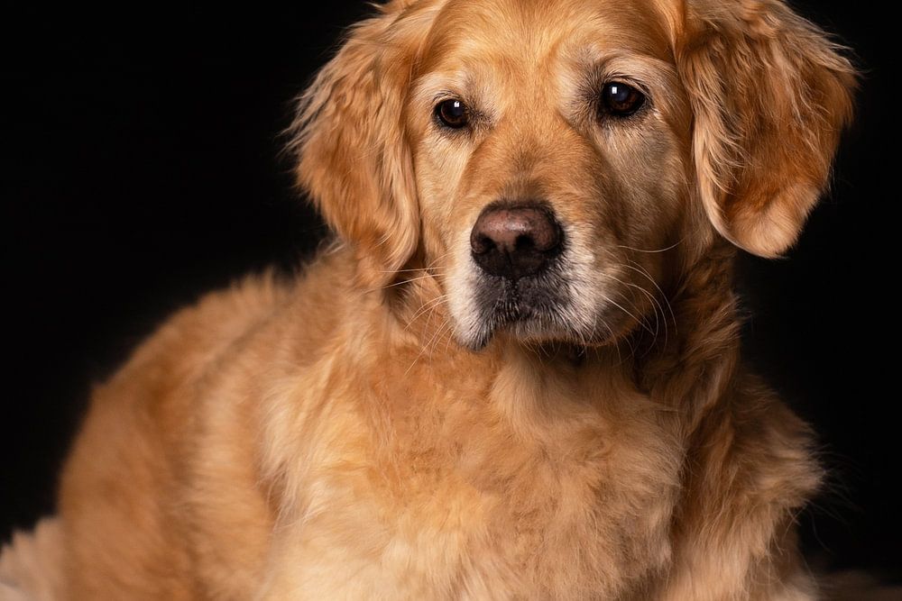 Portraitfoto mit schwarzem Hintergrund von einem sehr süßen blonden Labrador