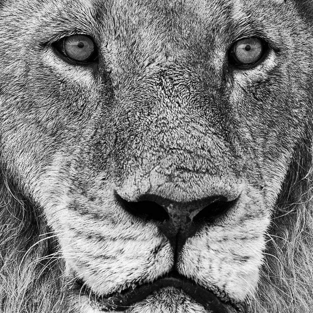 Einfarbiges Hauptporträt eines männlichen Löwes. Das Schwarz-Weiß-Foto zeigt den Löwen von vorne und der Löwe schaut fast direkt in die Kamera.