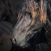Bestelle das Foto Porträt eines Pferdes mit dunklem Hintergrund von Harrie Muis als Reproduktion auf Leinwand, Alu-Dibond, als Poster, Fototapete oder Acrylglasbild.