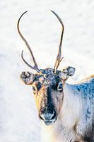 Rentiere, die im Winter in der Arktis in Nordnorwegen im Schnee grasen. Die Rentiere leben in einer natürlichen Umgebung als halbdomestizierte Hirsche in einer Herde, die frei umherzieht.