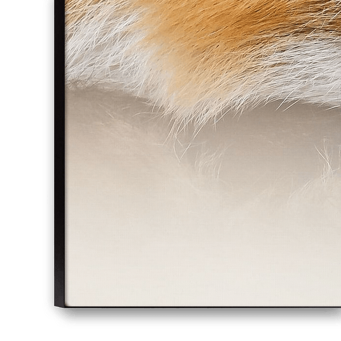 Ein Porträt eines Rotfuchses mit schönen Details seines Fells deutlich sichtbar und scharf. Der Fuchs hat sich den Schwanz vor das Gesicht gewickelt, um sich warm zu halten.