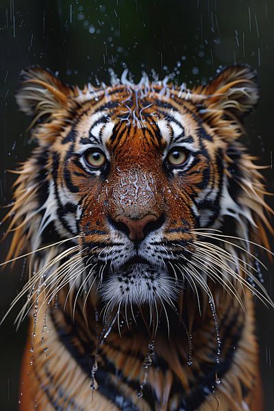 Dieses atemberaubende Foto fängt den intensiven Blick eines majestätischen Tigers im Regen ein. Die Regentropfen glitzern auf seinem Fell und unterstreichen die Stärke und Schönheit dieses prächtigen Tieres. Der dunkle Hintergrund schafft einen dramatischen Kontrast und lenkt die Aufmerksamkeit auf die durchdringenden Augen des Tigers. Ein perfektes Kunstwerk für Liebhaber der Tier- und Naturfotografie.