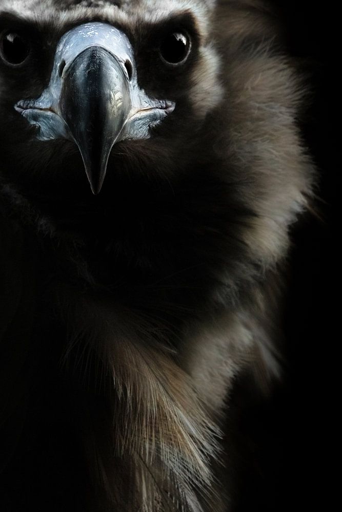 Ein Porträt von einem majestätischen afrikanischen Geier, der mit seinen großen, schwatzen Augen direkt in Kamera schaut. Durch den schwarzen Hintergrund wirkt das Bild dunkel und der atemberaubende Vogel noch intensiver. Die hell-grauen Federn um den Hals wirken wie ein weicher, plüschiger Schal. Die dunkle Schulter verschwimmt mit dem schwarzen Hintergrund, wodurch der große Vogel mystisch und geheimnisvoll erscheint.