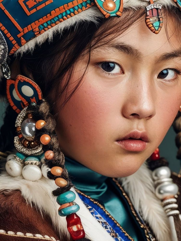 Porträt eines mongolischen Mädchens in traditioneller Tracht. Die Mongolei ist ein Land in Zentral- und Ostasien. Das Land grenzt im Norden an die autonomen Republiken Altaj, Tuwa und Burjatien, die alle zur Russischen Föderation gehören. Außerdem grenzt sie im Norden an die Transbaikalische Region und im Süden an die autonome Region Innere Mongolei, die zu China gehört. Seit 1990 ist die Mongolei eine Demokratie.