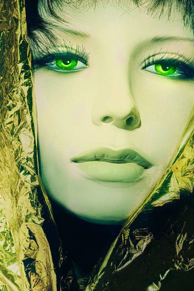 Das Porträt ist mit einer Schaufensterpuppe entstanden, und ich habe auch eine Rettungsdecke verwendet, die unter anderem dazu dient, jemanden zu wärmen. Das fand ich für diese Arbeit sehr passend.