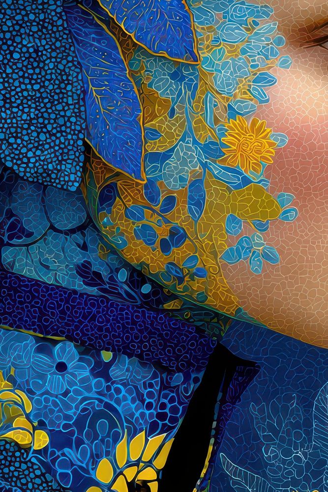 Kombination aus Fotografie und Malerei zeigt ein fiktives digitales Porträt in überwiegend gelben und blauen Farbtönen mit einer Anspielung auf Van Gogh