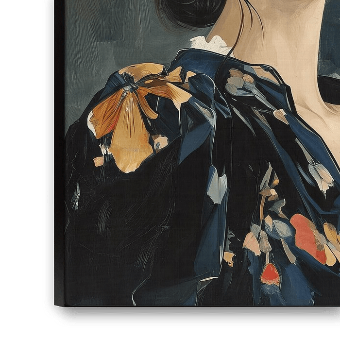 Illustriertes Porträt einer dunkelhaarigen jungen Frau mit Blumen. Warme Farben. Wählen Sie die Größe und das Material für diesen Blickfang selbst.