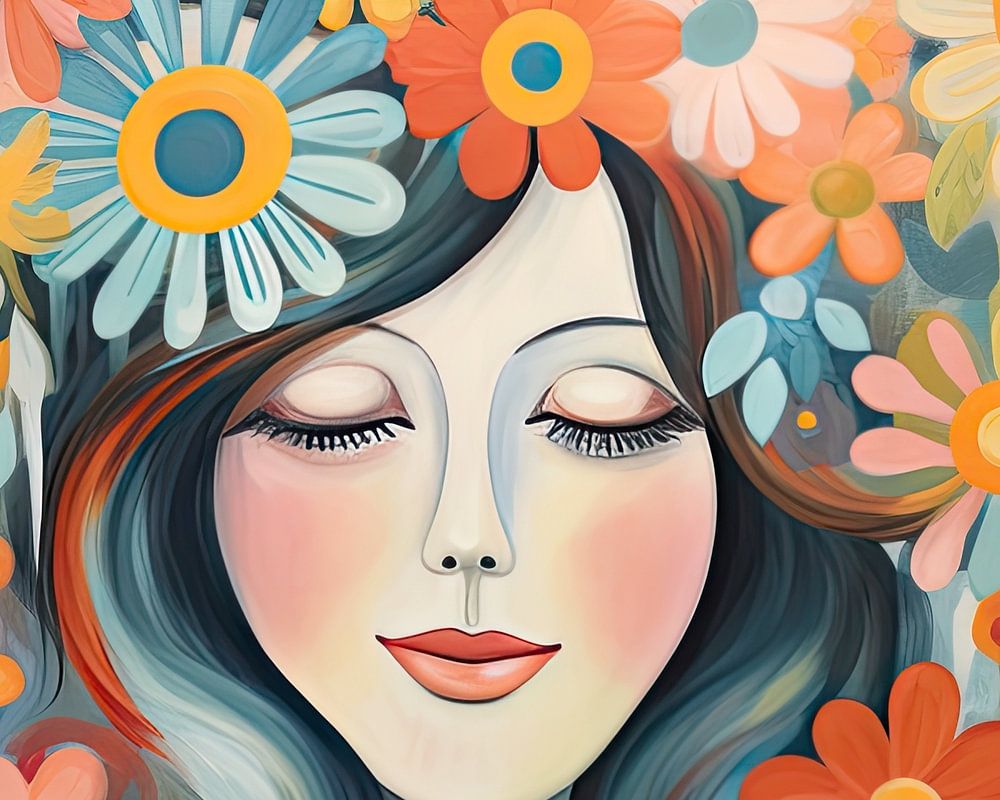 Bestelle dieses Blumen-Wandbild Porträt mit Blumen von Wunderbare Kunst als Reproduktion auf Leinwand, Alu-Dibond, als Poster, Fototapete oder Acrylglasbild.