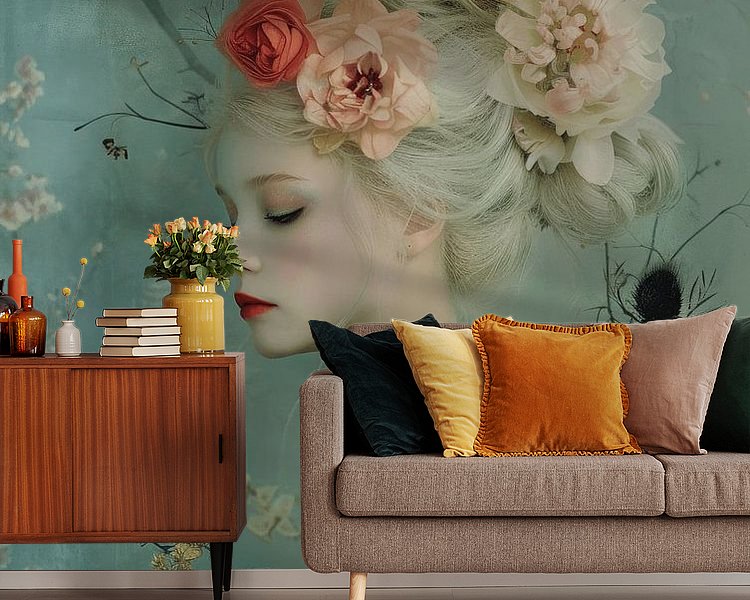 Porträt mit romantischem Look in Pastellfarben. Ein Mädchen/junge Frau ist von Blumen umgeben. Wählen Sie die Größe und das Material für dieses Werk und passen Sie es an Ihre Einrichtung an.