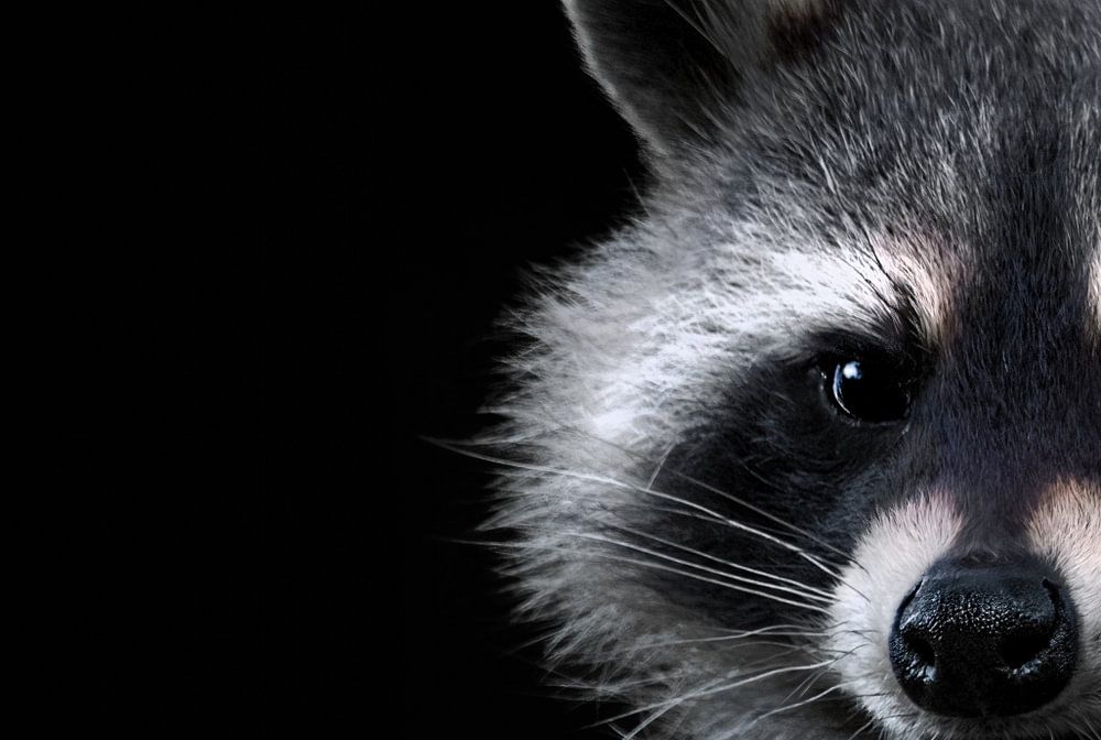 Dieser süße und flauschige Waschbär guckt direkt mit seinen schwarz-glänzenden Augen in die Kamera. Durch den dunklen Hintergrund lenkt nichts von dem knuddeligen Waschbären ab . Dadurch ist auch eine minimalistische Porträt-Nahaufnahme entstanden.