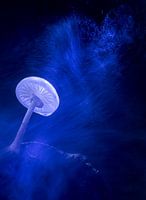 Dieser Porzellanpilz wurde in einer besonders schönen Umgebung fotografiert. Es sieht aus, als ob der Pilz von einem Wirbelsturm erfasst wurde. Das blaue Licht in den Spritzern und der dunkle Hintergrund heben den weißen Porzellanpilz schön hervor. Das Foto wurde mit dem Veluwezoom aufgenommen.
