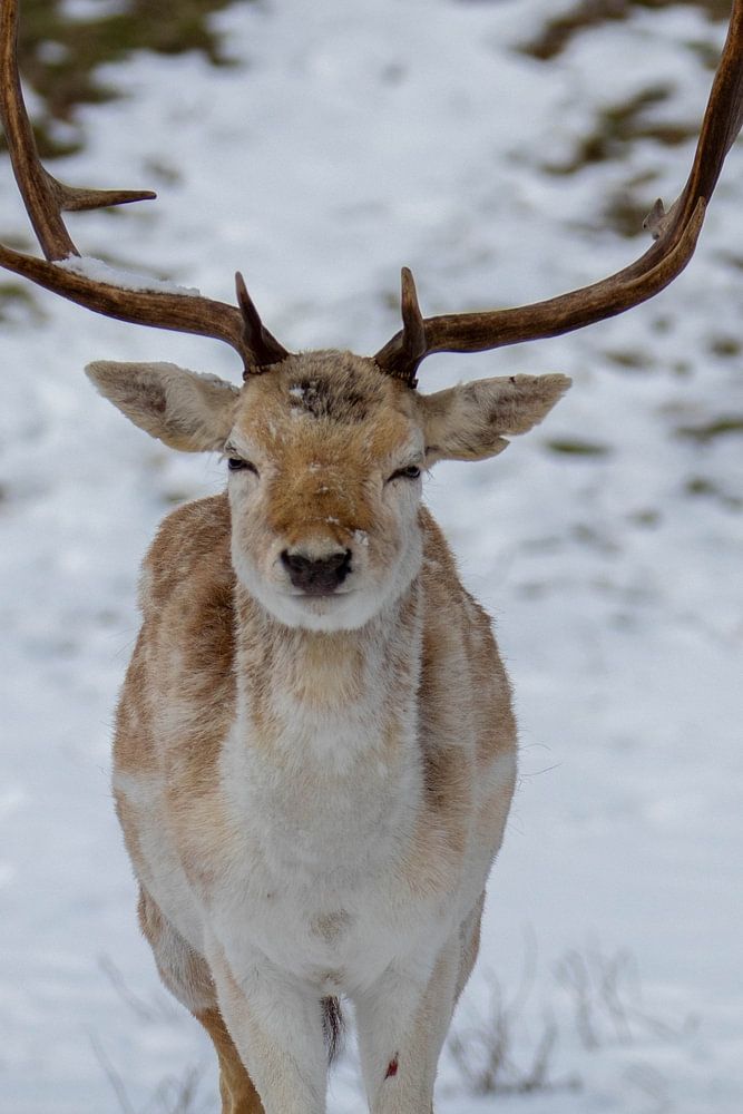Dieser Hirsch ergriff seine Chance, an einem verschneiten Tag in den Dünen von Zandvoort Modell zu stehen.