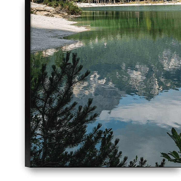 Landschaftsfoto der Spiegelung des Pragser Wildsees in den italienischen Dolomiten